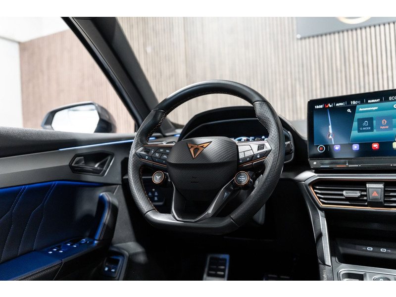 Snelheid, omgevingsinfo, navigatie en communicatie... Het digitale dashboard geeft alles realtime weer. Soepel inparkeren gaat gemakkelijker dan u verwacht dankzij de achteruitrijcamera. Adaptive cruise control houdt de ingestelde snelheid vast en houdt automatisch afstand tot uw voorligger. Deze Cupra Formentor is 'connected'. Belangrijke functies worden permanent gemeten en zijn uit te lezen via een speciale app, ook op afstand. Met spraakbediening of de knoppen op het stuur regelt u het audio-installatiesysteem en het navigatiesysteem, terwijl u uw blik op de weg gericht houdt. De audio-installatie biedt daarbij glasheldere ontvangst dankzij DAB-ontvangst. Ook is de Cupra uitgerust met: automatische airconditioning, draadloos opladen, regensensor, keyless entry en automatisch dimmende binnenspiegel.