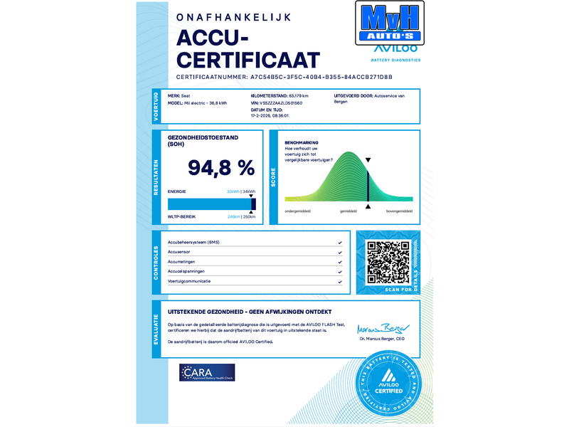 Deze SEAT Mii Electric Plus is uitgerust met een 36,8 kWh accupakket (32,3 kWh netto bruikbaar) en heeft een WLTP-actieradius van ca. 259 km.
