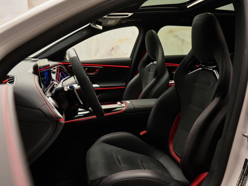 Het interieur combineert sportiviteit met hoogstaand comfort dankzij de AMG Performance-stoelen (555/PBY) met stoelverwarming vooraan (873), Memorypakket (275), viervoudig verstelbare lendensteunen (U22) en een verwarmd AMG Performance-stuurwiel in nappaleder/microvezel (L6K/443).