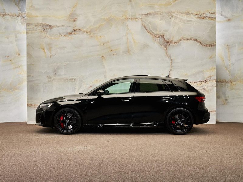 Het uitgesproken karakter van de Audi RS3 Sportback wordt versterkt door zijn sportieve en hoogwaardige afwerking. Het RS Designpakket Rood Plus (PEJ) geeft het interieur een extra dynamische uitstraling met contrasterende accenten. De Sportstoelen vóór (Q4P) in combinatie met Lederen bekleding (N1Y) bieden uitstekende steun en comfort, zelfs bij sportief rijden. Aan de buitenzijde zorgen Matrix-ledkoplampen, ledachterlichten en koplampsproeiers (PXC) voor een krachtige lichtsignatuur en optimale zichtbaarheid. De 19 inch lichtmetalen velgen (52W) en RS-Instaplijsten vóór met aluminium segmenten (VT2) benadrukken het exclusieve RS-karakter. Deze combinatie van luxe materialen, sportieve details en geavanceerde verlichtingstechnologie maakt deze RS3 tot een echte blikvanger