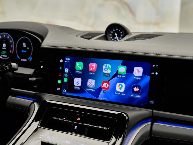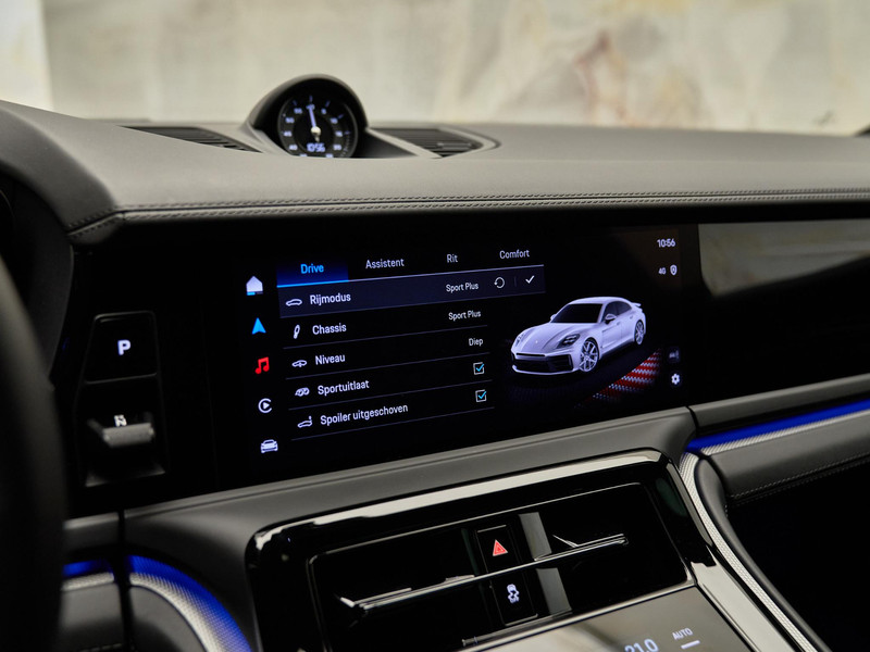 Het interieur van deze Panamera 4 E-Hybrid is gericht op maximaal comfort en hoogwaardige afwerking. De Comfortstoelen (Q2J) zijn 14-voudig elektrisch verstelbaar en voorzien van een memorypakket, waardoor altijd de ideale zitpositie kan worden ingesteld. Voor extra luxe zijn de voorstoelen uitgerust met stoelventilatie (4D3) en is het sportieve karakter benadrukt met een verwarmd GT-sportstuurwiel (2PJ). Het panoramadak (3FU) zorgt voor een lichte en ruimtelijke ambiance in het interieur.