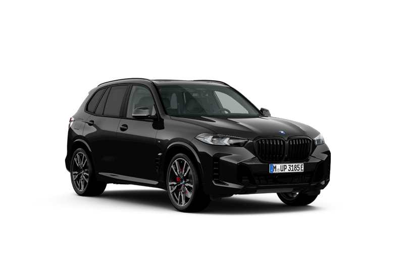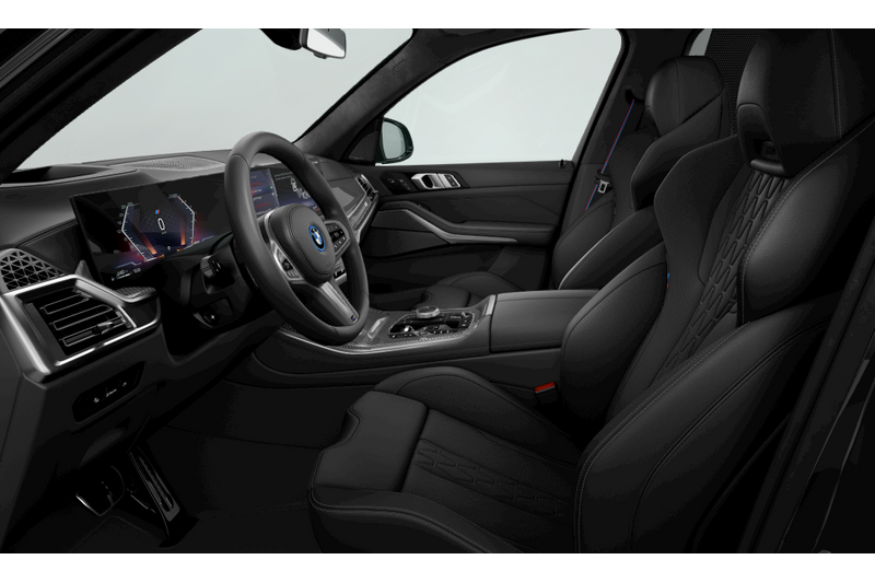 De Saphirschwarz metallic (475) lak benadrukt het krachtige karakter van deze X5. In combinatie met het M Sportpakket (P337A) en M Sportpakket Pro (P33BA) ontstaat een bijzonder dynamische uitstraling dankzij de M Aerodynamicapakket (S715A), M Dakrailing in hoogglans Shadow Line (S3MCA), en de M Koplampen Shadow Line (S3MFA). De 22" M lichtmetalen wielen V-spaak 747M Bicolor (S1SMA) en de M Hoogglans Shadow Line (S760A) versterken het sportieve profiel. De BMW Iconic Glow nierengrille (S3DNA) zorgt voor een kenmerkend lichteffect, terwijl de Geluidwerende zijruiten (S3KAA) en Donker getint glas achter (S420A) zorgen voor rust en exclusiviteit.