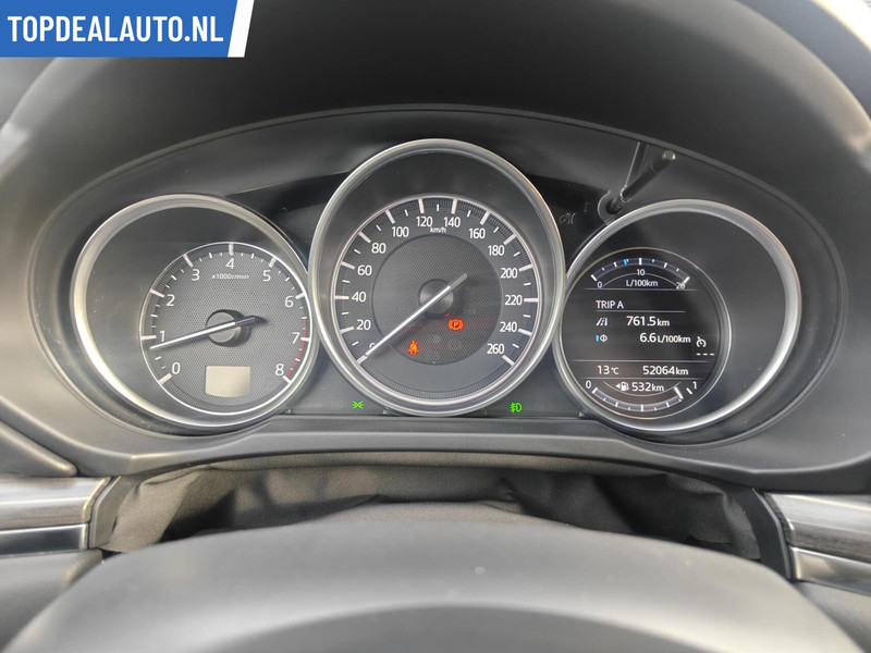 Pragmatisch en veilig als deze auto is, beschikt hij over diverse veiligheidssystemen. In het instrumentarium kunt u bovendien de verkeersborden zien die u onderweg tegenkomt. Zo helpt deze Mazda u om veiliger te rijden. Het Lane-keeping systeem doet precies wat nodig is: waarschuwen en corrigeren bij onbedoelde overschrijding van de rijstrooklijnen. De forward collision warning geeft een botswaarschuwing als een aanrijding dreigt met een voorligger. De auto is ook uitgerust met head-up display, dodehoekdetectie, hill hold functie, brake assist, vermoeidheidsherkenning en bandenspanningcontrolesysteem.