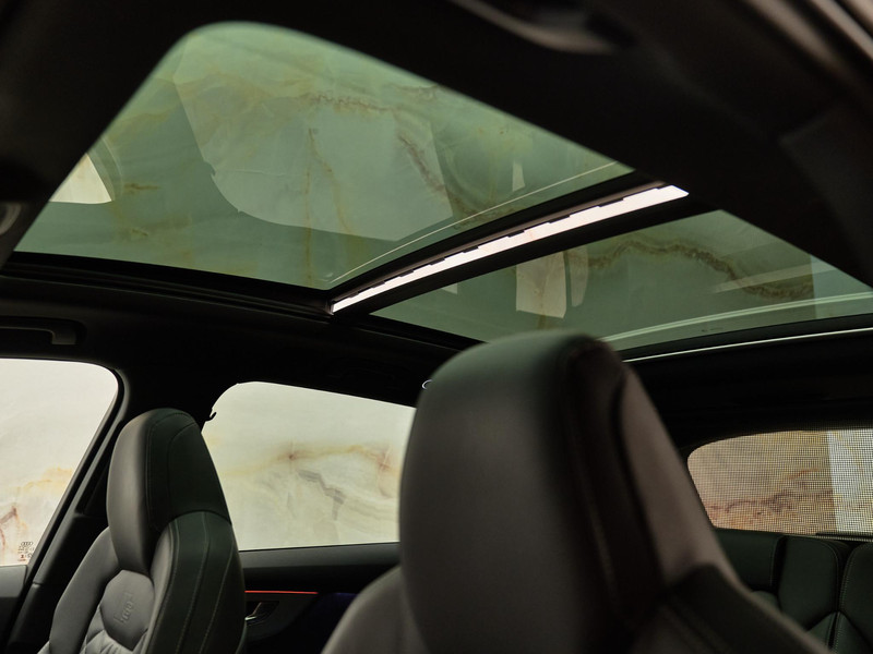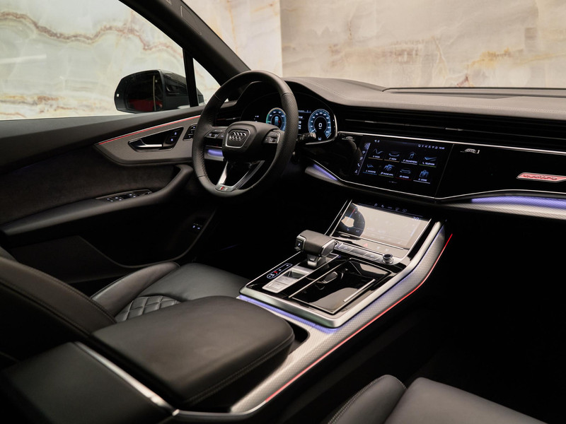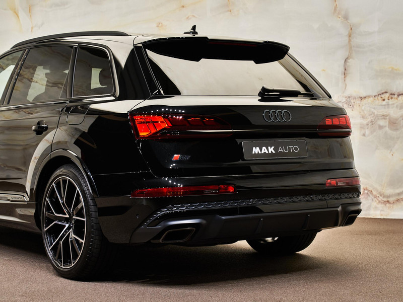 De S line-exterieuruitvoering (04H) en de 22 inch lichtmetalen velgen (54K/I27) geven de Q7 een sportieve en krachtige uitstraling. Het exterieur is verfraaid met dakrails zwart (3S2), donker getinte ruiten vanaf de B-stijl (QL5) en een dakspoiler (5J3). Binnenin wordt het interieur versterkt door sierlijsten zwart (4ZD) en een hoogwaardige hemelbekleding (6NQ).