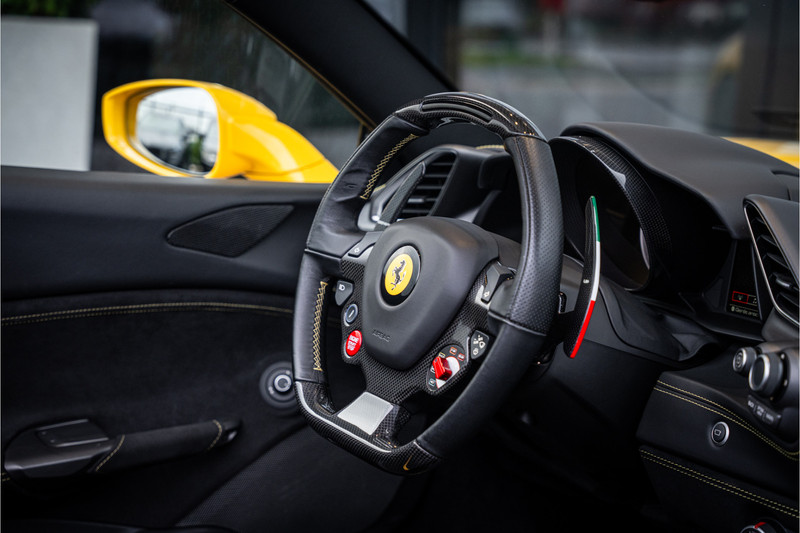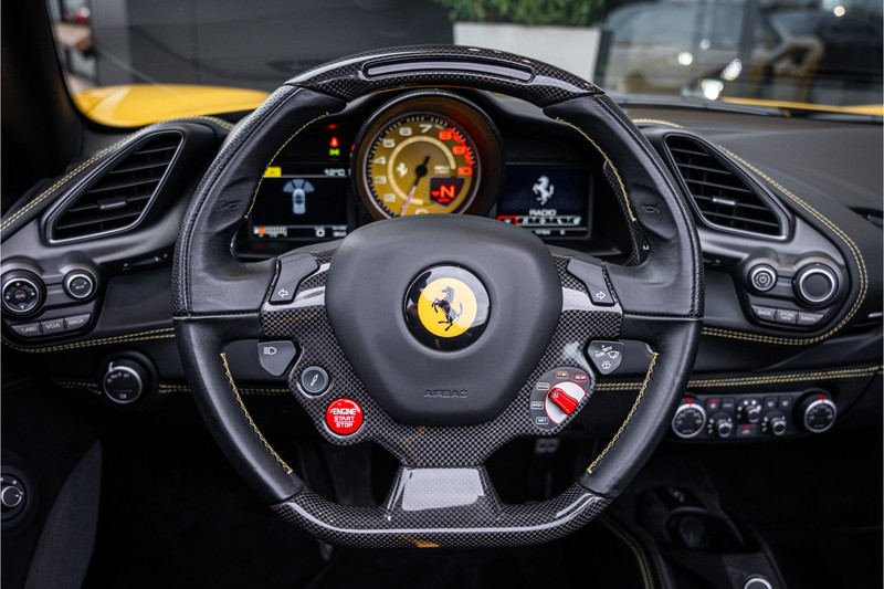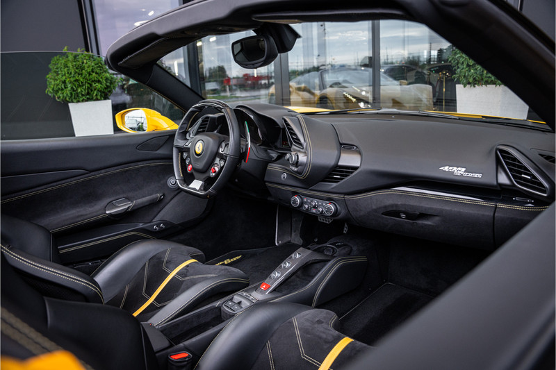 Het exterieur in Giallo Modena benadrukt de sculpturale vormen en aerodynamische elegantie van de 488 Spider, terwijl het interieur luxe en sportiviteit verenigt in perfecte harmonie. Fijn leder, carbonaccenten en een cockpit die volledig om de bestuurder is ontworpen creëren een omgeving waarin elk detail gericht is op prestatie en beleving.