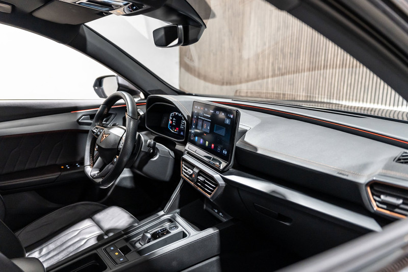 Alle functies die u onderweg nodig heeft, worden permanent geregistreerd en zijn afleesbaar op het digitale dashboard. De achteruitrijcamera geeft u duidelijk zicht op de ruimte achter de auto. Adaptive cruise control is een comfortabele en veilige optie. Het systeem reguleert de snelheid en houdt automatisch afstand tot uw voorligger. Het infotainmentsysteem bedient u met uw vingers of met uw stem, met dank aan de geïntegreerde stembediening. In het zeldzame geval van een storing weet u nog eerder dan de monteur wat er mankeert. Uw smartphone met remote services geeft direct inzicht. U bent in deze Cupra ook voorzien van navigatiesysteem, electronic climate control, draadloos opladen, DAB ontvangst, regensensor en keyless entry.