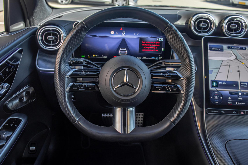 Deze GLC is uitgevoerd in strak zwart metallic en staat op fraaie 20 inch lichtmetalen velgen. De carrosserie is gepoetst en in perfecte conditie, waarbij het AMG Line-pakket zorgt voor een sportieve en dynamische uitstraling. Het panoramadak geeft het lijnenspel extra flair, terwijl de subtiele sfeerverlichting bijdraagt aan de premium beleving – ook van buitenaf een indrukwekkende verschijning.