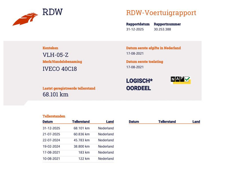 Bij een goede occasion als deze hoort natuurlijk ook een tellerrapport van Nationale Autopas. Heeft u interesse in deze mooie IVECO? Bel ons dan of mail ons, om een afspraak te maken.