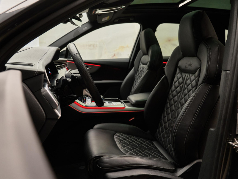 Deze Audi Q7 straalt kracht en verfijning uit dankzij het S line exterieur (04H) en de indrukwekkende 22 inch lichtmetalen velgen (54K) met 285/35 R22 banden (I27) van Audi Sport / quattro GmbH (FQ1). De uitstraling wordt versterkt door het royale panoramadak (3FU), privacy glas (QL5), zwarte dakreling (3S2) en zwarte buitenspiegelhuizen (6FJ). De hoogwaardige lichttechnologie met HD-matrix-ledkoplampen met Audi-laserlicht (PXB) en led-achterlichten met dynamische richtingaanwijzers (8VM) zorgt voor optimale zichtbaarheid én een moderne lichtsignatuur. Praktische details zoals de elektrisch inklapbare buitenspiegels met geheugen (6XL), RVS tildrempelbescherming (2P2) en warmtewerend glas (4GF / 4KC) maken het exterieur compleet.