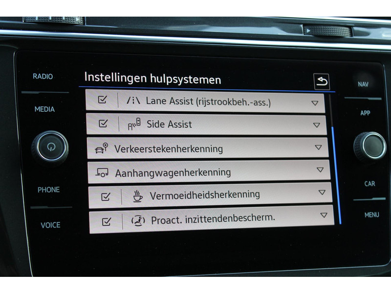 De nieuwste veiligheidssystemen komen in deze Volkswagen Tiguan samen. Verkeersborddetectie herkent tijdelijke en permanente verkeersborden langs en boven de weg. Voorzien van het Lane-keeping systeem. Ofwel: blijf automatisch in je baan. Het forward collision warning-systeem is constant alert en detecteert via sensor de afstand tot voorliggers. Wordt die te klein, dan volgt een automatische waarschuwing. Dankzij veiligheidsvoorzieningen als dodehoekdetectie, accident avoidance system, hill hold functie, Abs - anti blokkeer systeem met brake assistant, vermoeidheidsherkenning en bandenspanningcontrolesysteem, bent u steeds veilig onderweg.