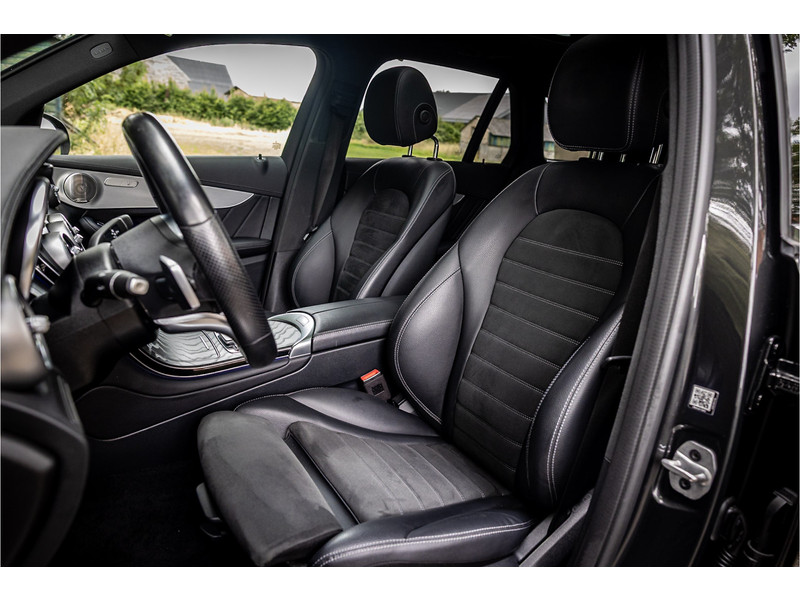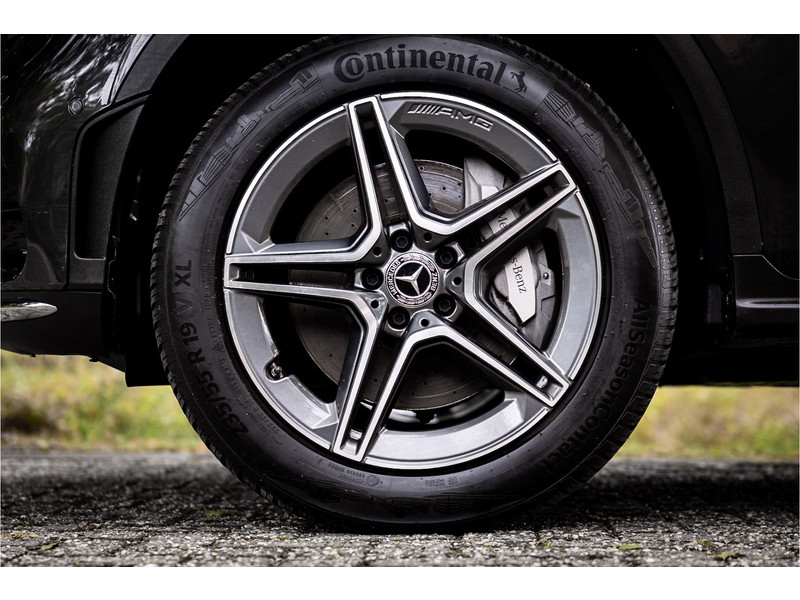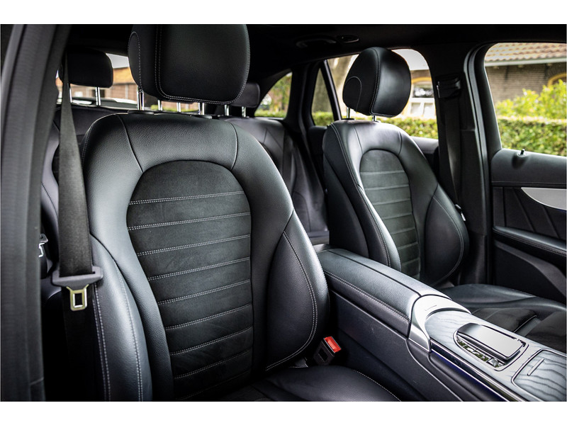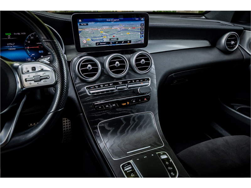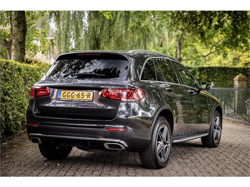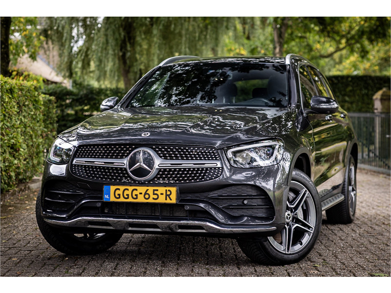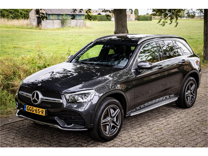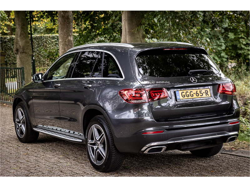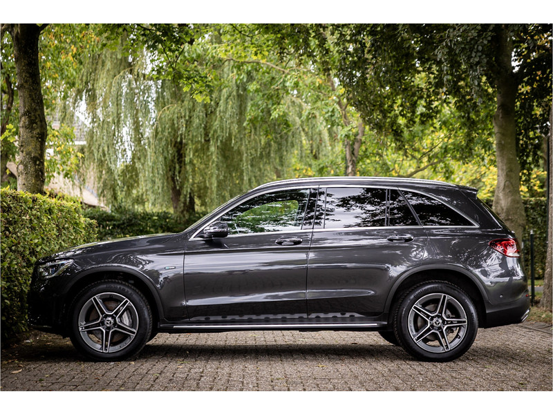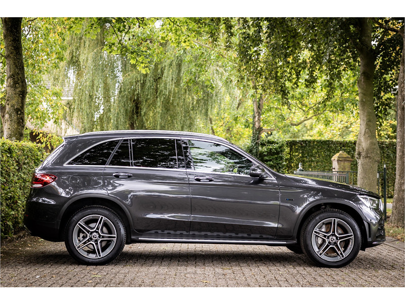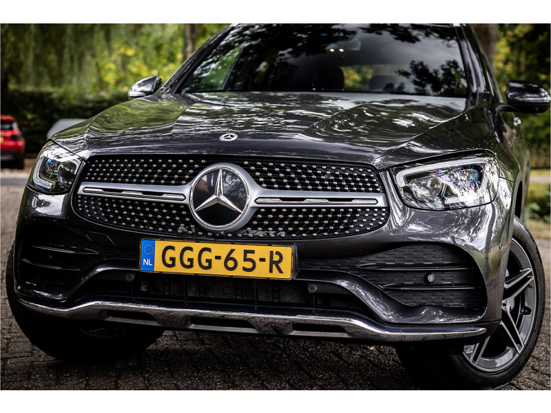 Fraaie Mercedes GLC300 de plug in hybride met dieselmotor in AMG Line uitvoering. Lakkleur is Graphite Grey metallic en het interieur is voorzien van black Artico leerimitatie in combinatie met alcantara.