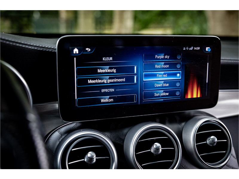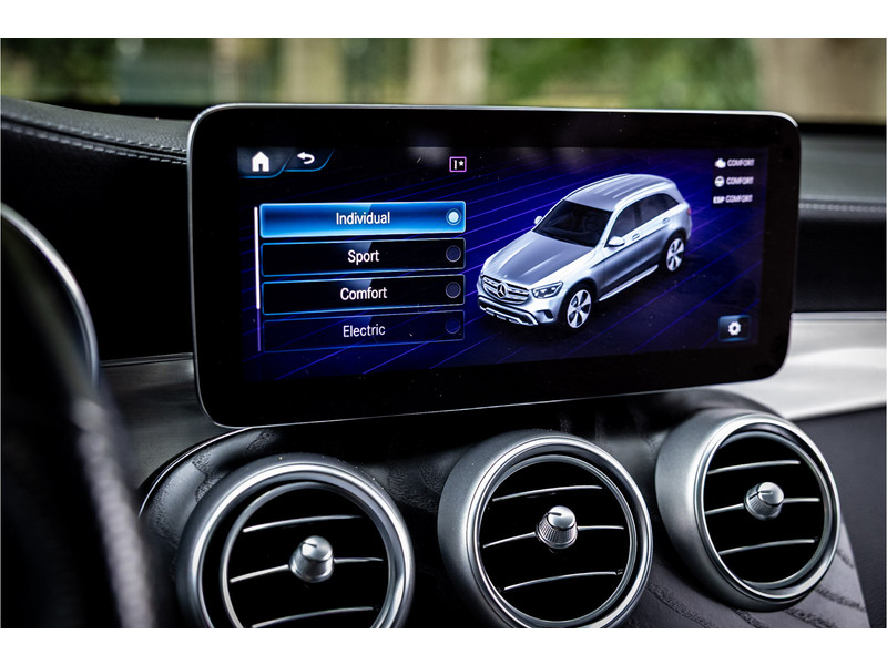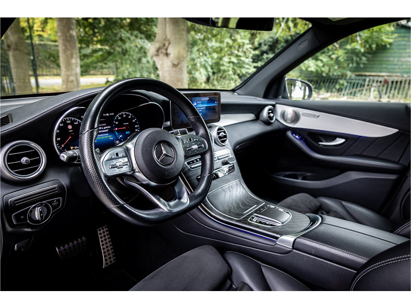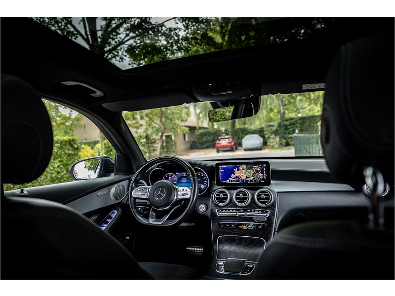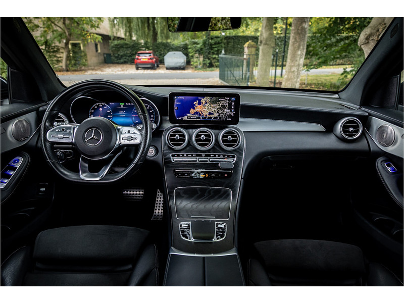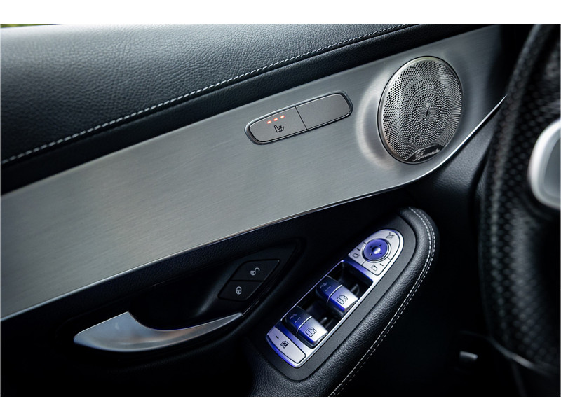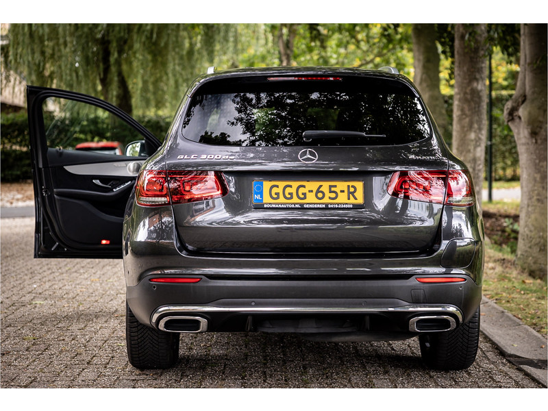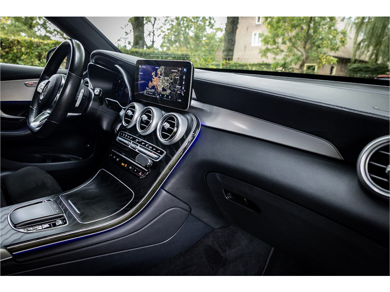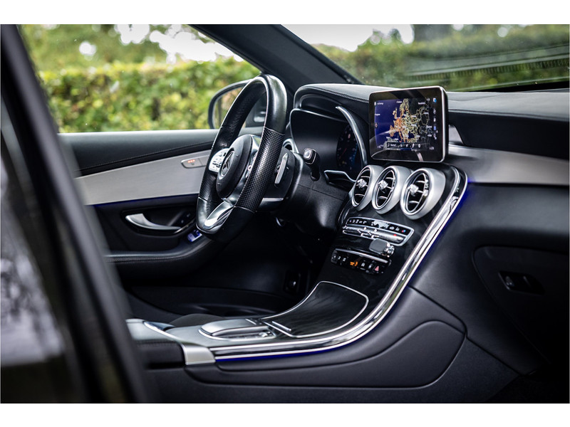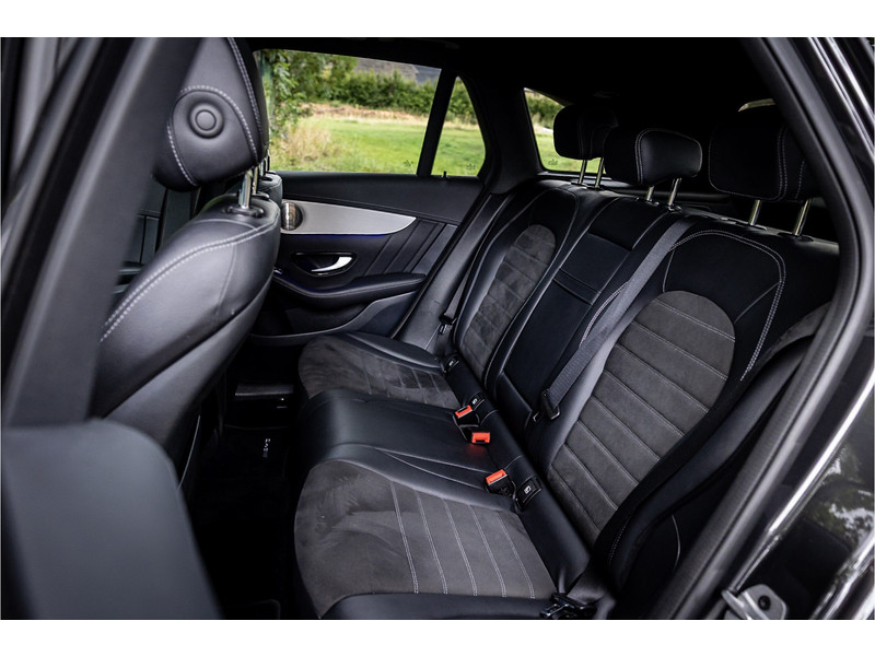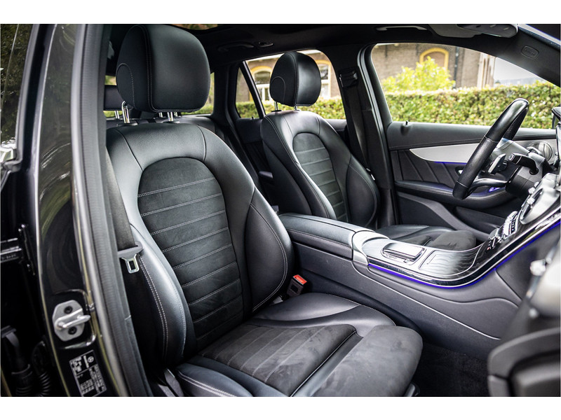 Fraaie Mercedes GLC300 de plug in hybride met dieselmotor in AMG Line uitvoering. Lakkleur is Graphite Grey metallic en het interieur is voorzien van black Artico leerimitatie in combinatie met alcantara.