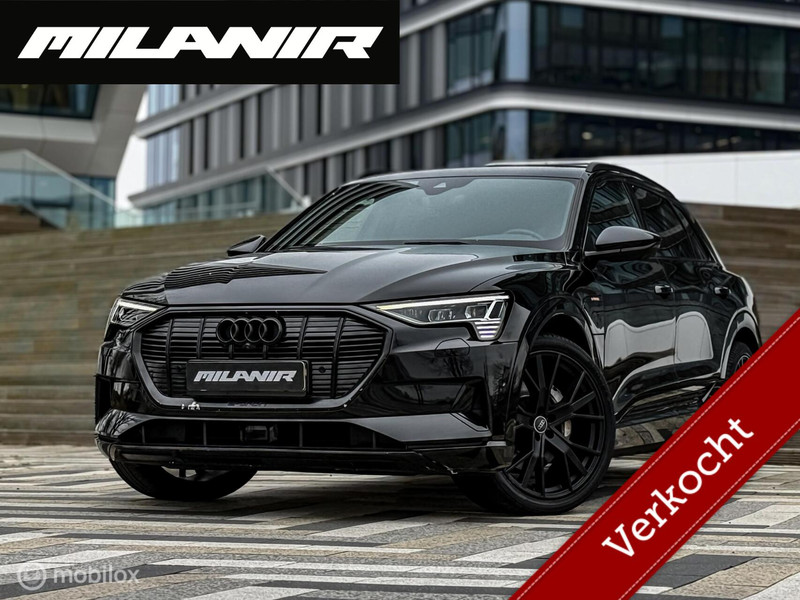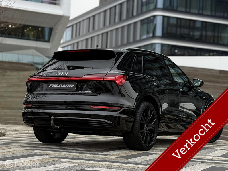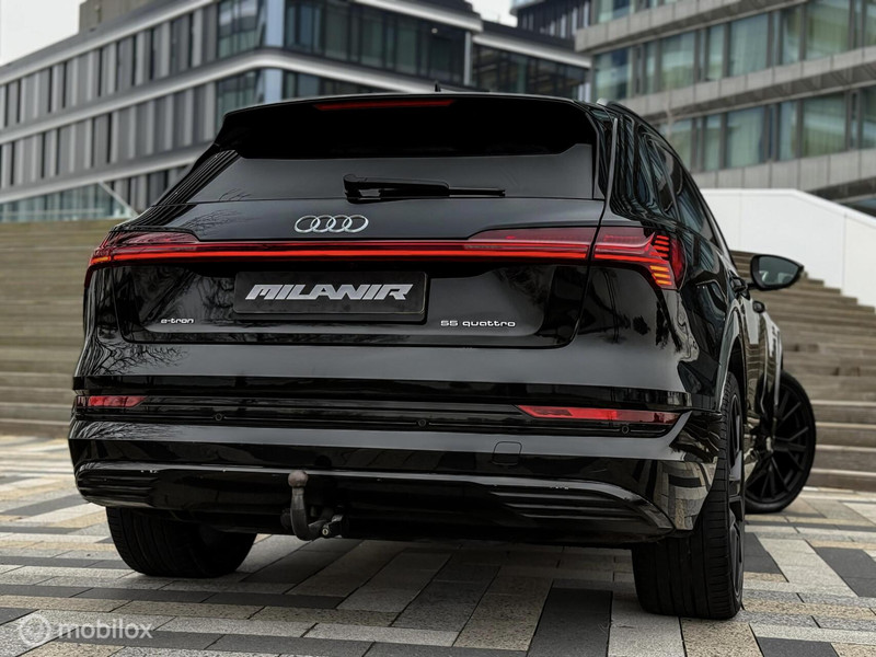 Prachtige Audi e-tron 55 in stijlvolle black on black uitvoering. Deze luxe elektrische SUV heeft een WLTP-actieradius van ca. 420 km en is voorzien van mooie opties zoals lederen bekleding, adaptieve cruise control, geheugenstoelen en een 360° camera.