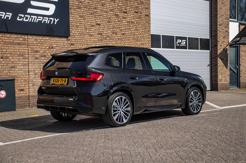 Deze iX1 is uitgevoerd in diepzwart, wat perfect aansluit bij het sportieve M-Sport pakket. De absolute blikvangers zijn de 20 inch BMW Individual velgen, die de auto een exclusieve en krachtige 'stance' geven. Het grote panoramadak zorgt voor een schitterende lichtinval in het interieur en een luxe uitstraling van buitenaf. Voor de nodige praktische inzetbaarheid is de auto tevens voorzien van een trekhaak. Dankzij de aerodynamische lijnen en de moderne BMW-verlichting is dit een EV die overal bewonderende blikken oogst.