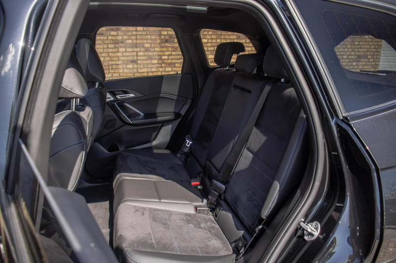 Deze iX1 is uitgevoerd in diepzwart, wat perfect aansluit bij het sportieve M-Sport pakket. De absolute blikvangers zijn de 20 inch BMW Individual velgen, die de auto een exclusieve en krachtige 'stance' geven. Het grote panoramadak zorgt voor een schitterende lichtinval in het interieur en een luxe uitstraling van buitenaf. Voor de nodige praktische inzetbaarheid is de auto tevens voorzien van een trekhaak. Dankzij de aerodynamische lijnen en de moderne BMW-verlichting is dit een EV die overal bewonderende blikken oogst.