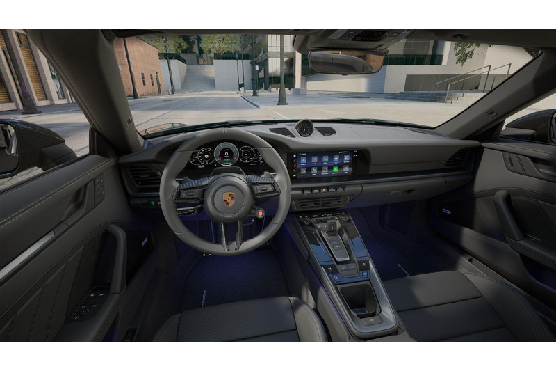 De sportieve uitstraling wordt versterkt door zwart zijdeglans gespoten wielen (1NX) en hoogglans zwart gespoten remzadels (1LR). Subtiele details zoals de exclusief ontworpen tankdop (2W6), het ‘911’ logo (2RA) en de verlichte carbon dorpellijsten (7M8) onderstrepen het exclusieve karakter. Het interieurpakket carbon mat (5MH) en het verwarmde GT-sportstuurwiel met carbon stuurwielpaneel (2PF) maken het geheel compleet.