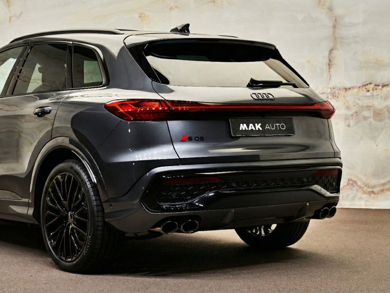 Deze SQ5 is uitgevoerd met het Optiekpakket zwart (PAH), Audi Sport 21 inch lichtmetalen velgen (53A), donker privacy glas achter (QL5) en rode remzadels (PC2). De hemelbekleding in zwart (6NQ) en het verlichtingspakket (QQ4) met sfeervolle LED-ambienteverlichting zorgen voor een bijzonder hoogwaardige uitstraling. De garageopener (VC2) maakt het plaatje af.