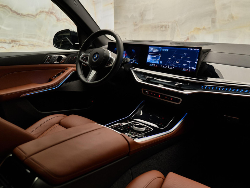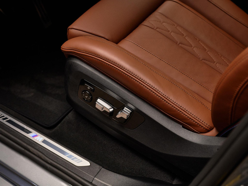 Het interieur is uitgevoerd in BMW Individual leder ‘Merino’ Tartufo (VATQ) met een leder bekleed dashboard (S4M5A), Pianolak interieurlijsten (S4MLA) en Ambiance verlichting (S4URA) voor een stijlvolle, verfijnde sfeer.