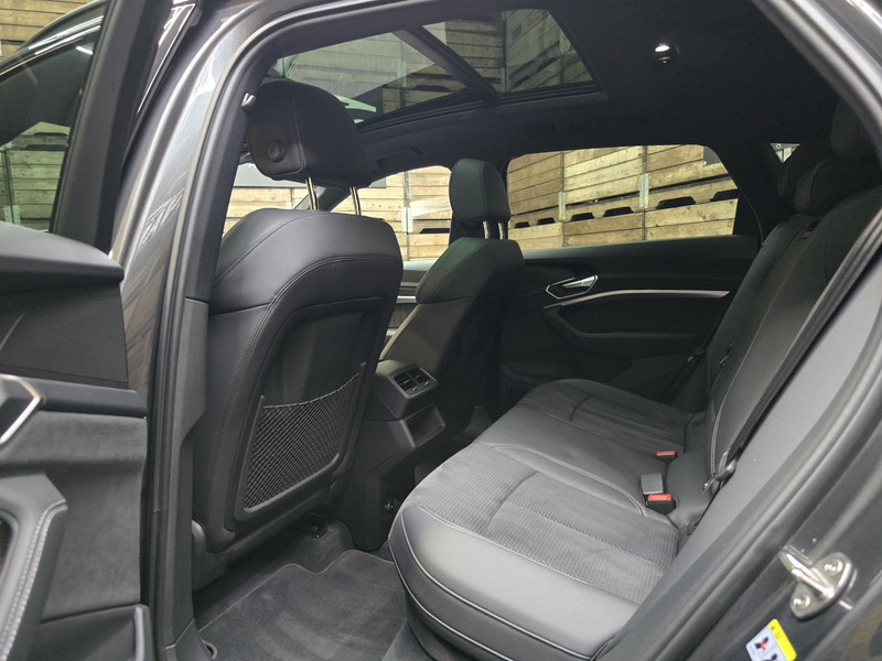 Gebouwd voor liefhebbers van autorijden, deze Audi E-tron levert sportieve prestaties en onafgebroken rijplezier. Een aantrekkelijke en fraaie optie is de expressieve S-Line styling. De ruime lichtinval door het elektrisch bediende glazen panorama dak zorgt voor een heerlijk ruim gevoel. Met één klik te openen voor frisse lucht en een mild windje in de auto. Dat is gemak en plezier! Overigens is het happy-klik gevoel ook aanwezig bij de elektrisch bedienbare achterklep. Hoe koud het buiten ook is, de stoelverwarming geeft u meteen een behaaglijk gevoel. Ribbels en hobbels in de weg worden royaal gladgestreken door de aanwezige luchtvering. Verder is de Audi uitgerust met: LED koplampen, halflederen bekleding, warmtewerend glas, in delen neerklapbare achterbank, LED-achterlichten en verstelbare lendensteunen.