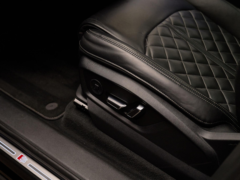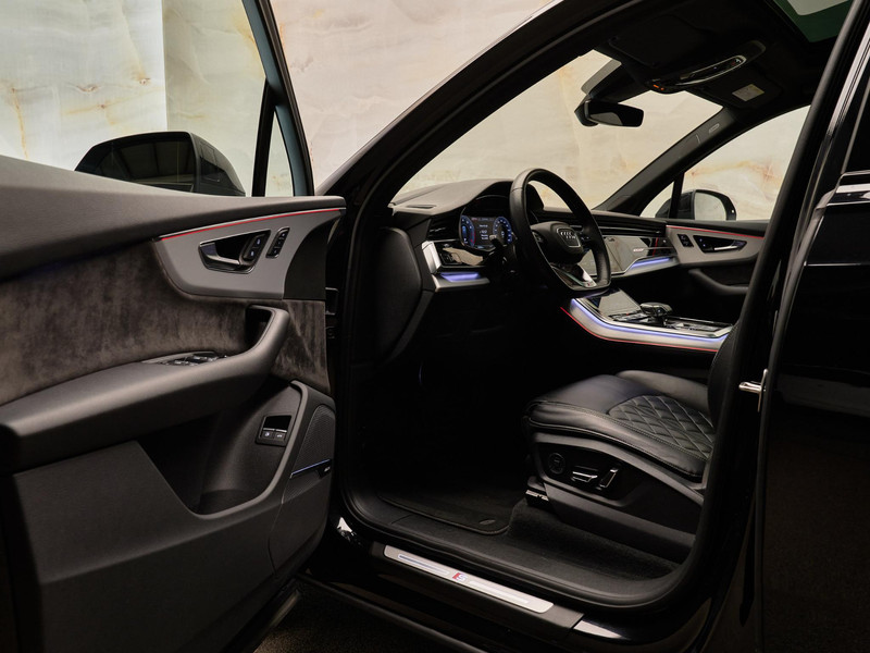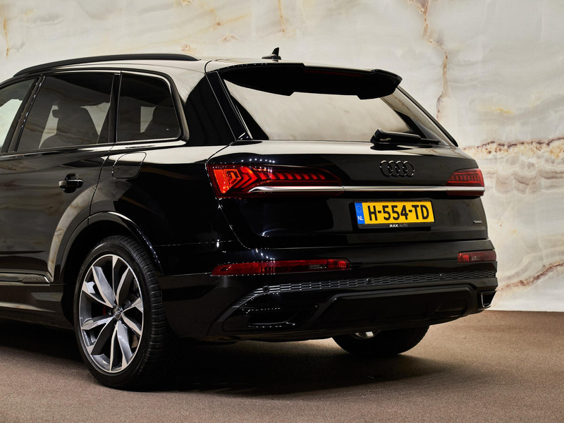 Het krachtige design van deze Q7 wordt benadrukt door de 21-inch lichtmetalen velgen (42P) met 285/40 R21 banden (H7M) en de dakreling zwart (3S2). De uitstraling wordt verder versterkt door HD Matrix LED-koplampen met Audi laserlicht (PXB), LED-achterlichten met dynamische richtingaanwijzers (8VP) en een dakspoiler (5J3). Het grote panoramadak (3FU) zorgt voor extra licht en ruimte in het interieur.