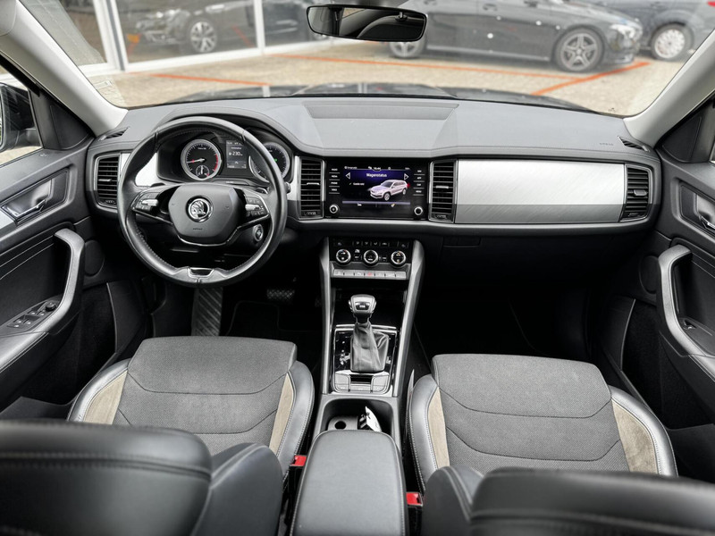 Strak uitgevoerde Škoda Kodiaq uit modeljaar 2021, voorzien van de krachtige en efficiënte 1.5 TSI motor met 150 pk en een comfortabele automaat. Het betreft hier het faceliftmodel van de eerste generatie, herkenbaar aan de vernieuwde verlichting, grille en afwerking.