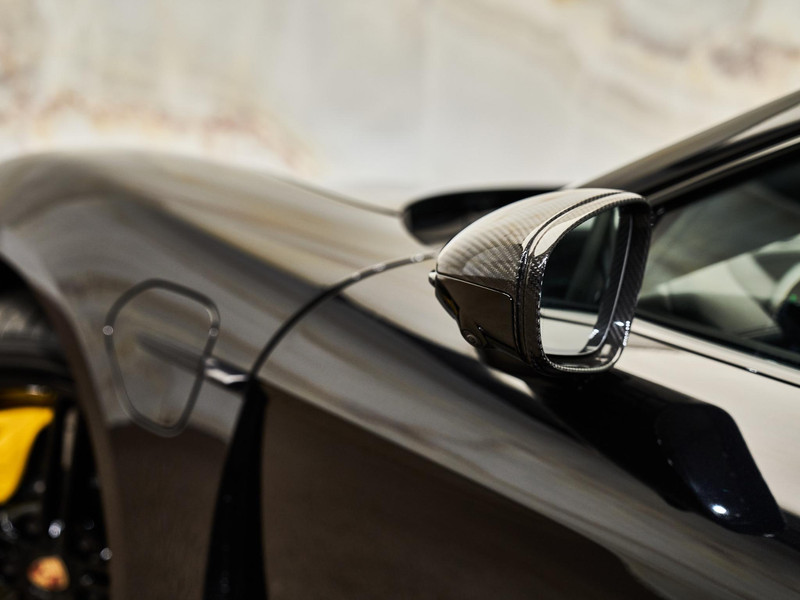 De Taycan Turbo S is uitgevoerd in Diepzwart metallic (2T), wat perfect samengaat met de in diepzwart metallic gespoten wielen (1NW). Het exclusieve SportDesign Pakket carbon (2D3) en de buitenspiegelhuizen bovenzijde carbon (6FQ) benadrukken het sportieve en high-performance karakter. De Led-matrix koplampen gletsjer ijsblauw inclusief PDLS Plus (8JU) zorgen niet alleen voor optimale zichtbaarheid, maar geven de voorzijde ook een uiterst herkenbare lichtsignatuur. Het vaste panoramadak (3FG) versterkt het ruimtelijke gevoel in het interieur, terwijl de geluid- en warmtewerende privacybeglazing (VW6) extra comfort en exclusiviteit biedt.