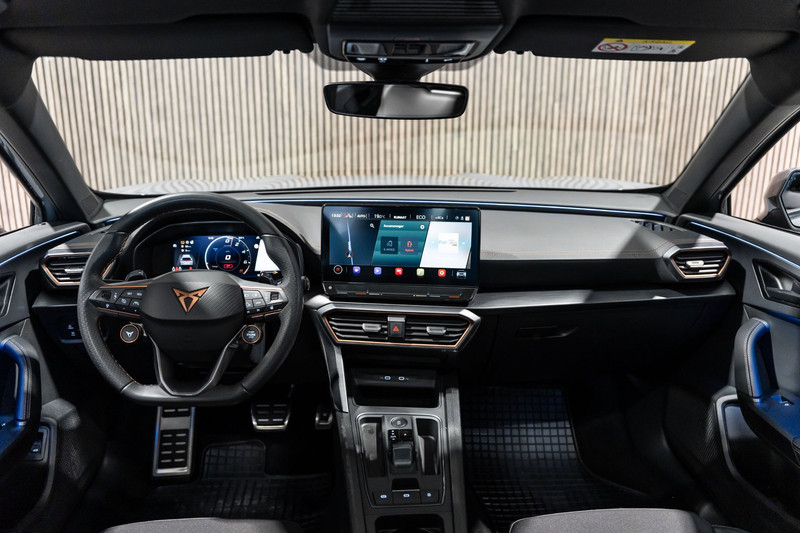 Snelheid, omgevingsinfo, navigatie en communicatie... Het digitale dashboard geeft alles realtime weer. Soepel inparkeren gaat gemakkelijker dan u verwacht dankzij de achteruitrijcamera. Adaptive cruise control houdt de ingestelde snelheid vast en houdt automatisch afstand tot uw voorligger. Deze Cupra Formentor is 'connected'. Belangrijke functies worden permanent gemeten en zijn uit te lezen via een speciale app, ook op afstand. Met spraakbediening of de knoppen op het stuur regelt u het audio-installatiesysteem en het navigatiesysteem, terwijl u uw blik op de weg gericht houdt. De audio-installatie biedt daarbij glasheldere ontvangst dankzij DAB-ontvangst. Ook is de Cupra uitgerust met: automatische airconditioning, draadloos opladen, regensensor, keyless entry en automatisch dimmende binnenspiegel.