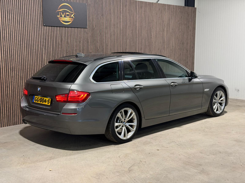 Een representatieve zakenauto, dat is deze BMW 5-serie Touring. Maar bovendien is hij veilig en comfortabel. Een krachtige motor geeft deze auto zijn sportieve prestaties. Stel u voor: zoevend over de snelweg terwijl het gulle daglicht het lederen interieur binnenvalt door het elektrisch bediende glazen panorama dak. En wat gemak betreft: daar zorgt onder andere de elektrisch bedienbare achterklep voor. Behaaglijk onderweg zijn? Als bestuurder geniet u van de verwarmbare voorstoelen. Net als uw bijrijder! De elektrisch verstelbare comfortstoelen van deze BMW 5-serie Touring staan bekend om zijn goede zithouding. Dankzij de xenonverlichting profiteert u in het donker van een krachtige en heldere lichtbundel. Tot de voorzieningen van deze auto behoren 17 inch lichtmetalen velgen, in delen neerklapbare achterbank en verwarmde ruitensproeiers.