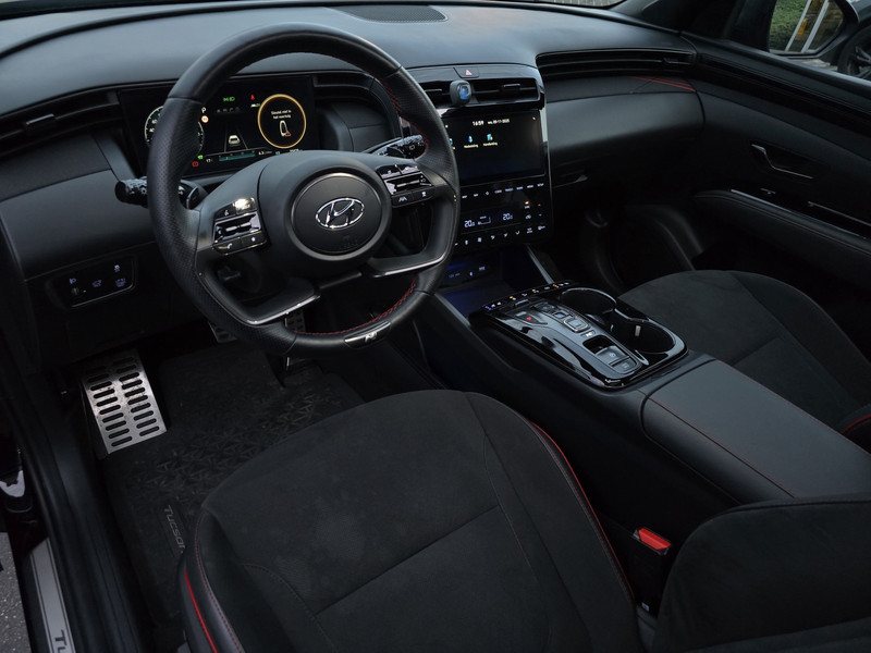 De N Line-uitvoering geeft de Tucson een sportieve uitstraling met strakke lijnen, een krachtige look en een interieur dat luxe en dynamiek uitstraalt. Zodra je instapt, voel je direct de kwaliteit en het oog voor detail. De panoramadak laat het interieur baden in licht, terwijl de verwarmde stoelen en het verwarmde stuur zorgen voor comfort op koude dagen. Dankzij het geheugen voor de bestuurdersstoel stap je altijd in met jouw ideale zitpositie.