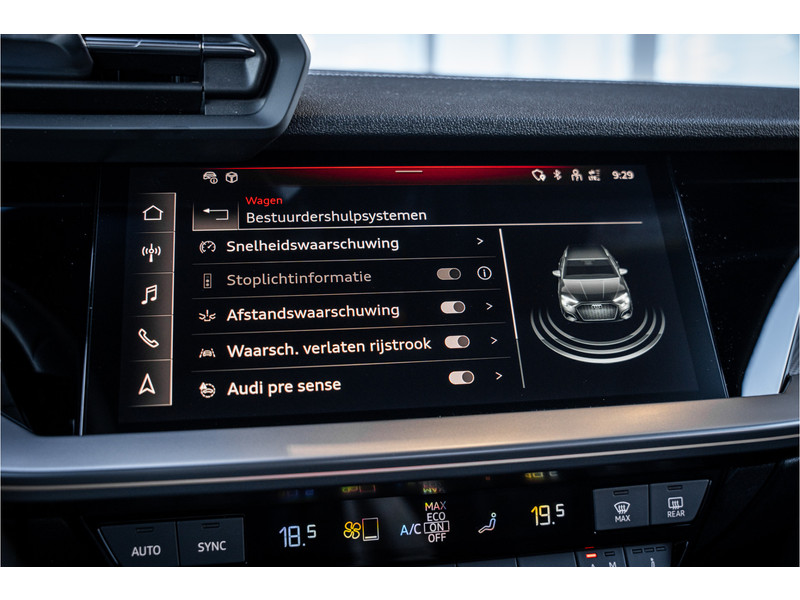 De automatische veiligheidssystemen in deze Audi fungeren als een extra paar ogen. En dat niet alleen, ze kunnen ook actief ingrijpen, om zo u en uw passagiers te beschermen. In het instrumentarium ziet u tijdens de rit ook de belangrijkste verkeersborden aangegeven, die de auto automatisch voor u leest. Het Lane-keeping systeem registreert permanent of u binnen de lijnen van de rijstrook blijft; dwaalt u onbedoeld af, dan waarschuwt het systeem en corrigeert de koers. De Brake Assist geeft een maximale boost aan het remsysteem in een noodsituatie. Zo verkort u de remweg en verkleint u de kans op ongelukken.