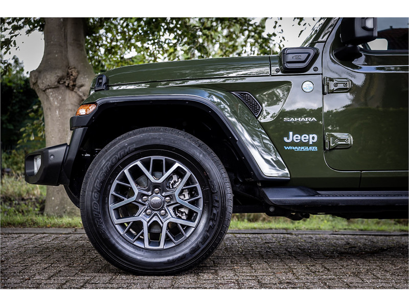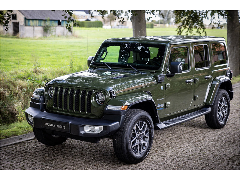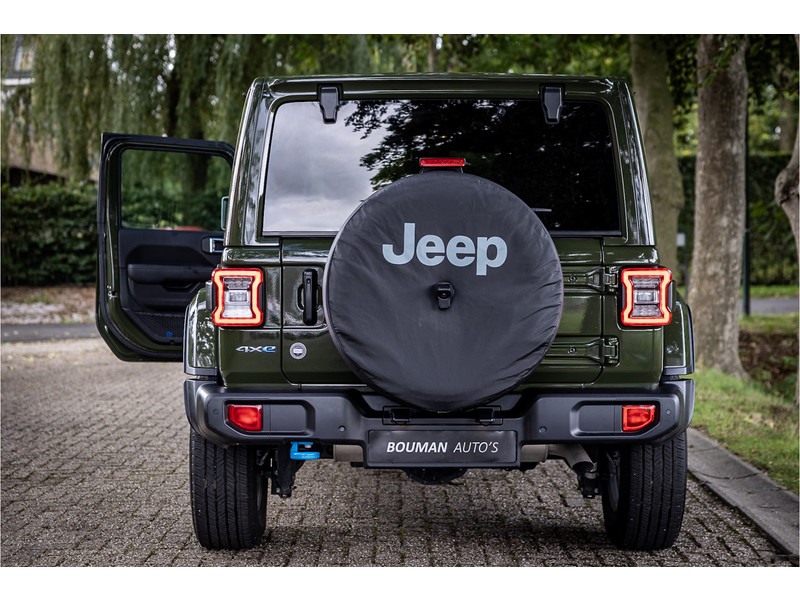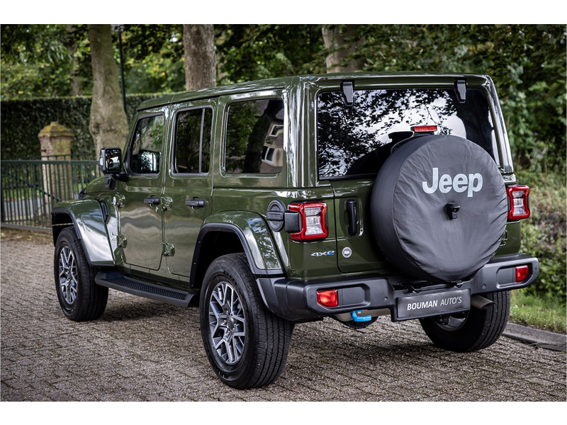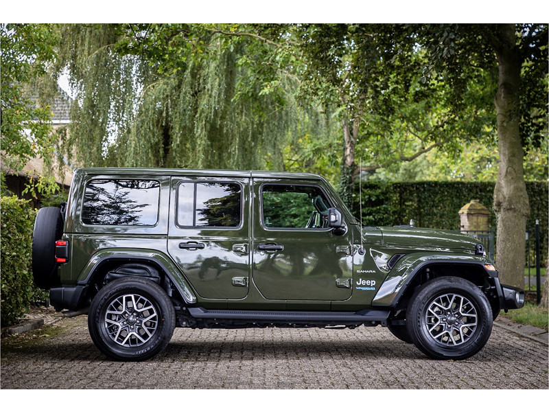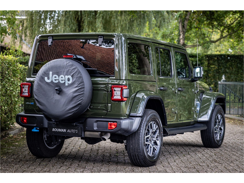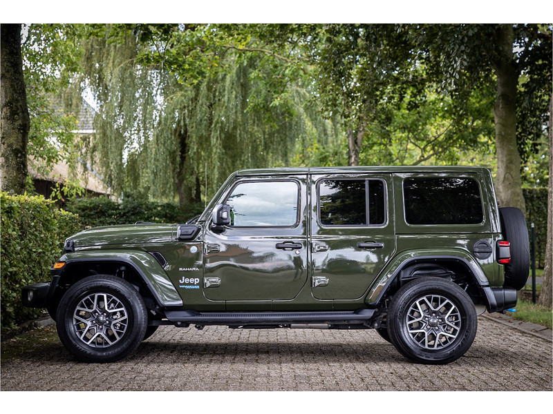 Fraaie Jeep Wrangler Unlimited 4xe 380 Sahara met plug in hybride aandrijving. Deze auto is afkomstig van de eerste eigenaar. Lakkleur is Sarge Green en het interieur is voorzien van zwart stof. Deze Wrangler is volledig open te rijden dankzij de uitneembare dakpanelen over de gehele lengte. Ook de portieren kunnen worden verwijderd en de voorruit is omklapbaar. Het rijden in de stad en snelweg kan volledig elektrisch worden gedaan, de elektrische actieradius bedraagt 45 kilometer.