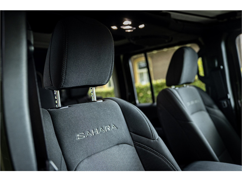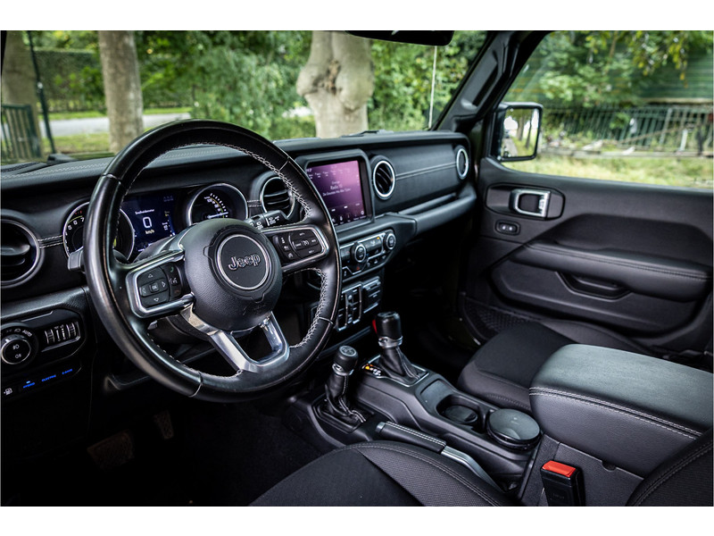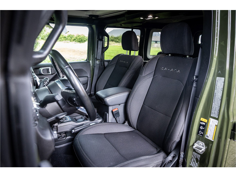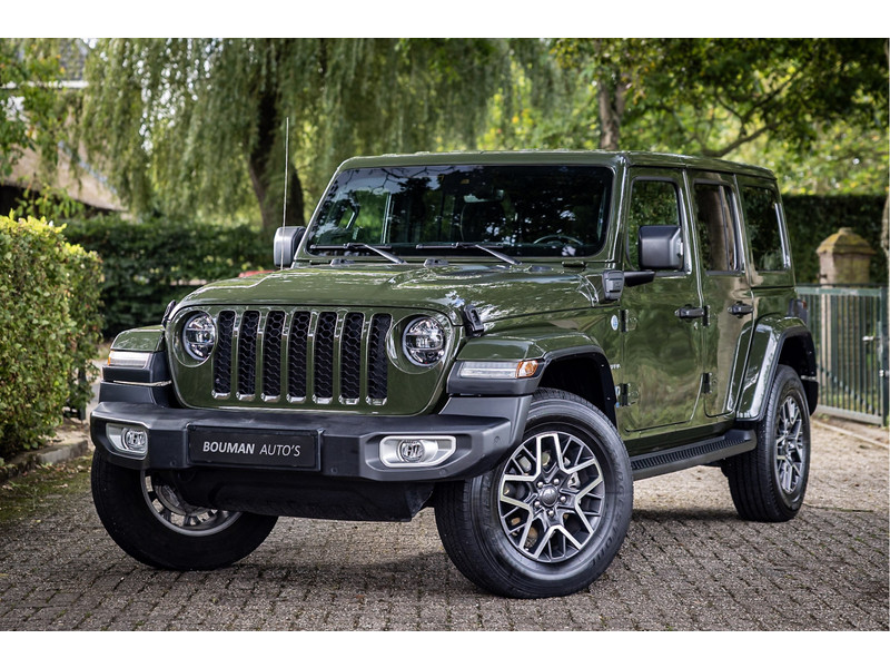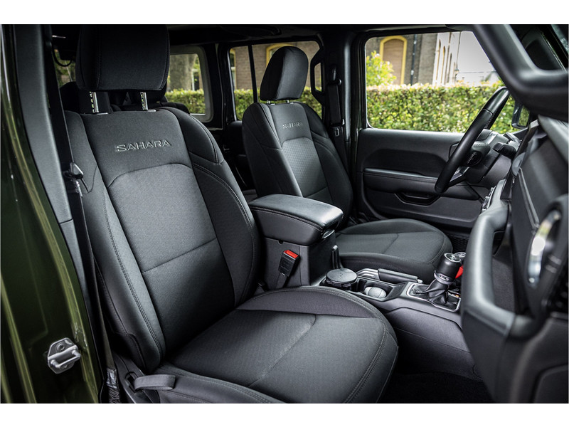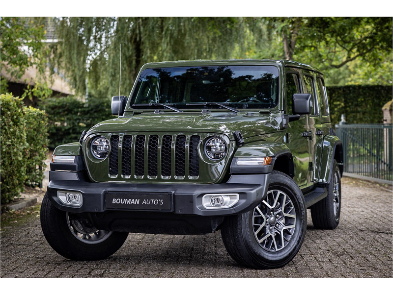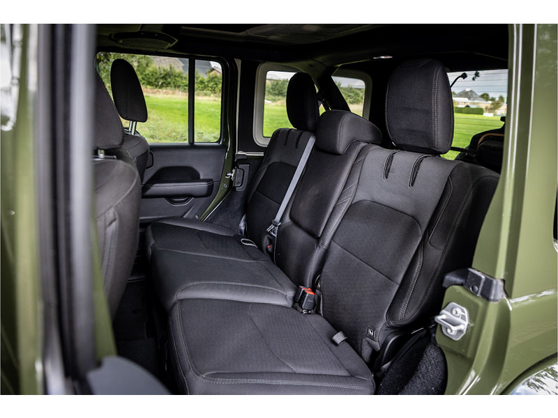 Fraaie Jeep Wrangler Unlimited 4xe 380 Sahara met plug in hybride aandrijving. Deze auto is afkomstig van de eerste eigenaar. Lakkleur is Sarge Green en het interieur is voorzien van zwart stof. Deze Wrangler is volledig open te rijden dankzij de uitneembare dakpanelen over de gehele lengte. Ook de portieren kunnen worden verwijderd en de voorruit is omklapbaar. Het rijden in de stad en snelweg kan volledig elektrisch worden gedaan, de elektrische actieradius bedraagt 45 kilometer.