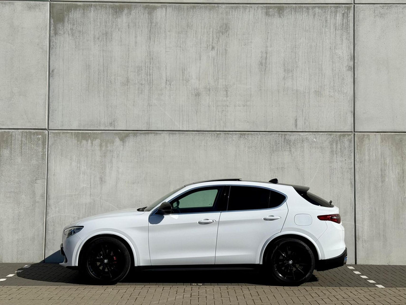 Deze Alfa Romeo Stelvio beschikt over een Pogea racing sportuitlaat, verbrede wielkuipranden, zwarte spoiler, zwarte diffuser en afneembare trekhaak.