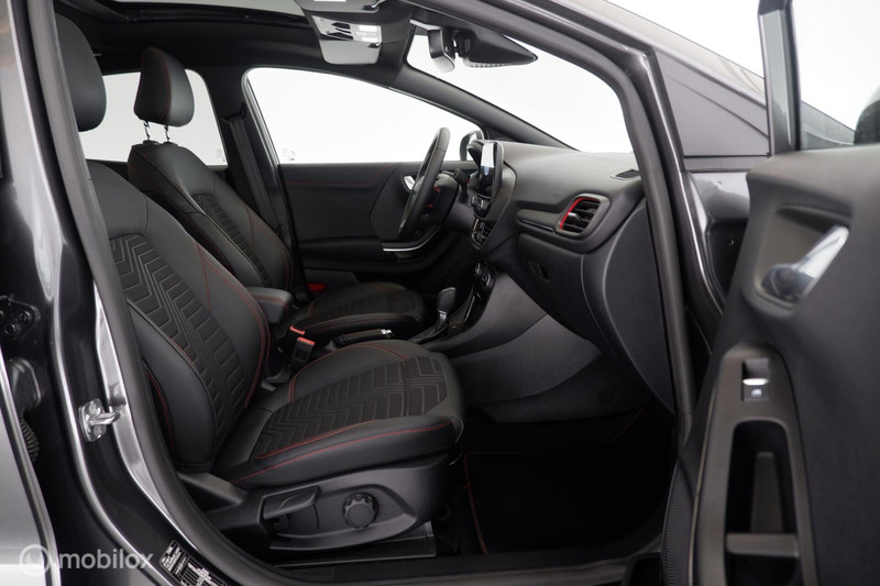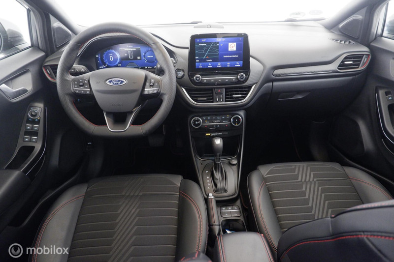 Sportieve en leuk uitgevoerde Ford Puma 1.0 EcoBoost Hybrid Automaat (7-Traps) ST-Line met Comfort-, Driver Assistance- en Winter Pack met o.a. Elektrisch Glazen Panoramadak, 1/2 Lederen Bekleding met Stoel- en Stuur Verwarming, Matrix Led Koplampen met Grootlicht Assistent en Volledige Led Verlichting, Volledig Digitaal Instrumenten Paneel, Navigatie, Bluetooth Telefoon met Multimedia Systeem en Draadloos Opladen, DAB Radio met Mirror Link Apple Carplay en Android Auto, Vol Automatische Airco met Elektrische Verwarmde Voorruit, Donkere Hemelbekleding, Rijstrook Assistent met Correctie, Achteruitrijcamera met Parkeer Assistent en Parkeersensoren Voor en Achter Dodehoek Detectie, Elektrisch Bedienbare Achterklep en 18 Inch Lichtmetalen Velgen.