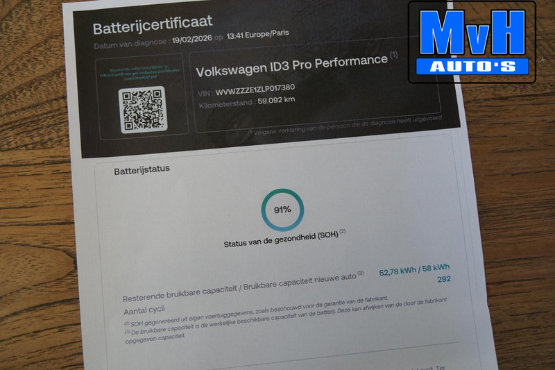 Deze auto heeft een SOH test van 91%. Zie foto van het rapport.