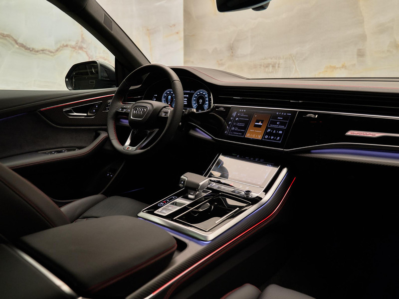 Het exterieur van de Audi Q8 straalt elegantie uit met zijn Daytonagrijs pareleffect lak (6Y6Y) en zwarte buitenspiegelhuizen (6FJ). Binnenin zorgen de hoogwaardige lederen bekleding met S-logo's en ruitpatroon (N0Q) en de decoratieve mat carbon twill inlegstukken (5MH) voor een luxueuze ambiance.