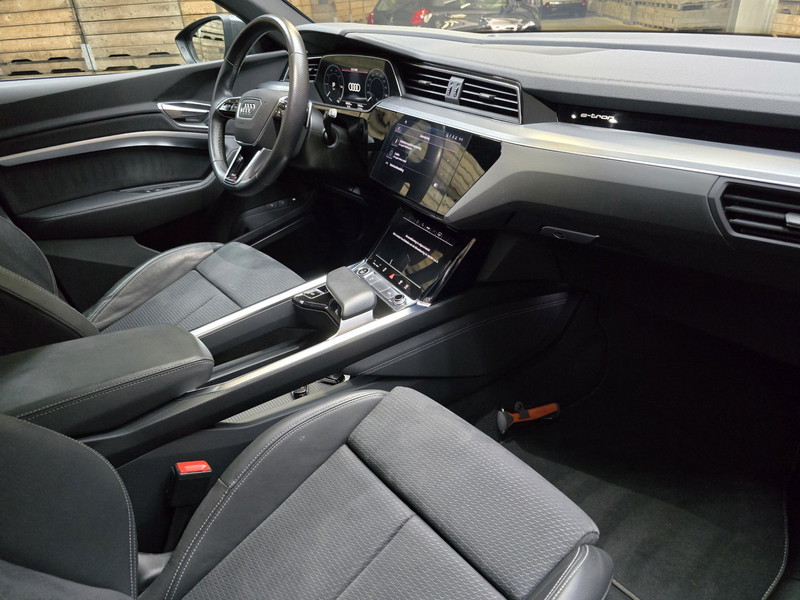Gebouwd voor liefhebbers van autorijden, deze Audi E-tron levert sportieve prestaties en onafgebroken rijplezier. Een aantrekkelijke en fraaie optie is de expressieve S-Line styling. De ruime lichtinval door het elektrisch bediende glazen panorama dak zorgt voor een heerlijk ruim gevoel. Met één klik te openen voor frisse lucht en een mild windje in de auto. Dat is gemak en plezier! Overigens is het happy-klik gevoel ook aanwezig bij de elektrisch bedienbare achterklep. Hoe koud het buiten ook is, de stoelverwarming geeft u meteen een behaaglijk gevoel. Ribbels en hobbels in de weg worden royaal gladgestreken door de aanwezige luchtvering. Verder is de Audi uitgerust met: LED koplampen, halflederen bekleding, warmtewerend glas, in delen neerklapbare achterbank, LED-achterlichten en verstelbare lendensteunen.