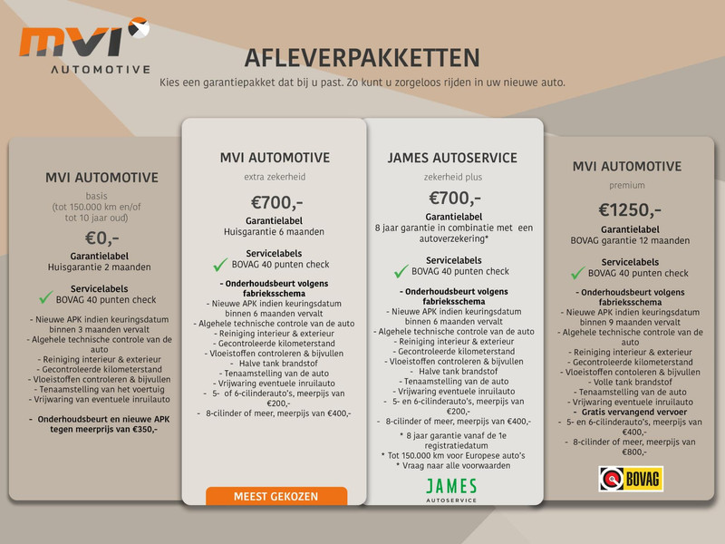 - Extra zekerheid (€ 700 meerprijs): Dit afleverpakket bevat (in plaats van afleverpakket "Basis"): BOVAG 40-Puntencheck; Huisgarantie (6 maanden garantie); 5- of 6-cilinderauto's meerprijs van €200,-, 8-cilinder of meer, meerprijs van €400,-, Algehele technische controle van de auto, Gecontroleerde kilometerstand, Halve tank brandstof, Nieuwe APK indien keuringsdatum binnen 6 maanden vervalt, Onderhoudsbeurt volgens fabrieksschema, Reiniging interieur & exterieur, Tenaamstelling van de auto, Vloeistoffen controleren & bijvullen, Vrijwaring eventuele inruilauto